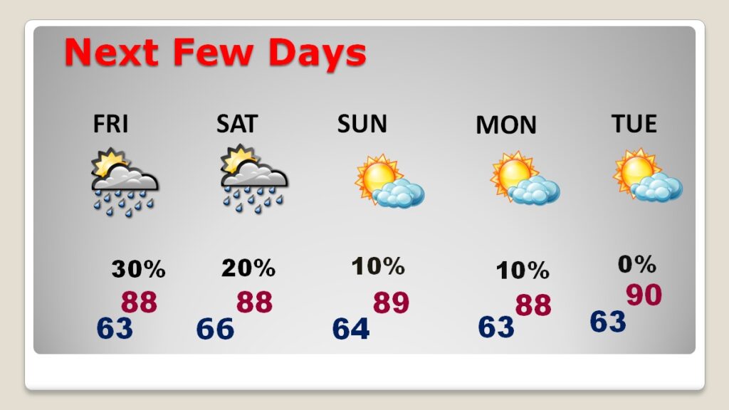 NEXT FEW DAYS: Little day to day change. Spotty random showers/storms are possible through Saturday, with the probability relatively small at each location. Sunday looks dry and mostly sunny. I have the rain chance under 20% Sunday and Monday, but not zero.