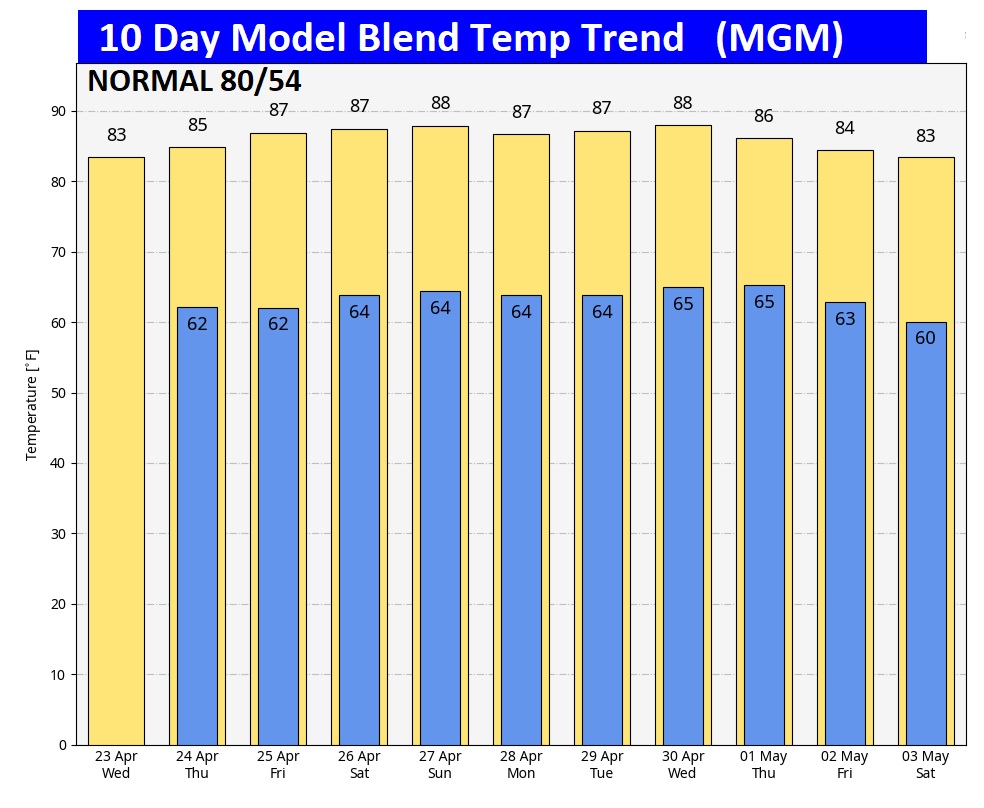Here’s the 10 day model blend temperature trend. Very warm pattern looks locked in for several days. Little day to day change with highs in the 80’s and lows in the 60’s.