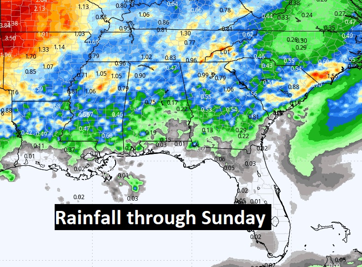 Here’s the expected rainfall this week. Not much for much of central and south Alabama. The better concentration will be in the northern counties, closer to the stalled front. Montgomery has had 4.74” on rain for the month, but it’s been 12 days since the last measurable rainfall at MGM.