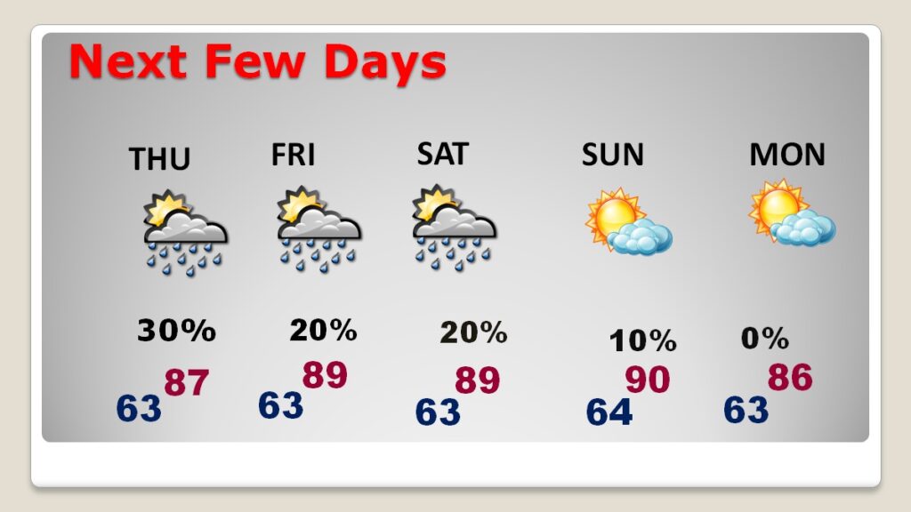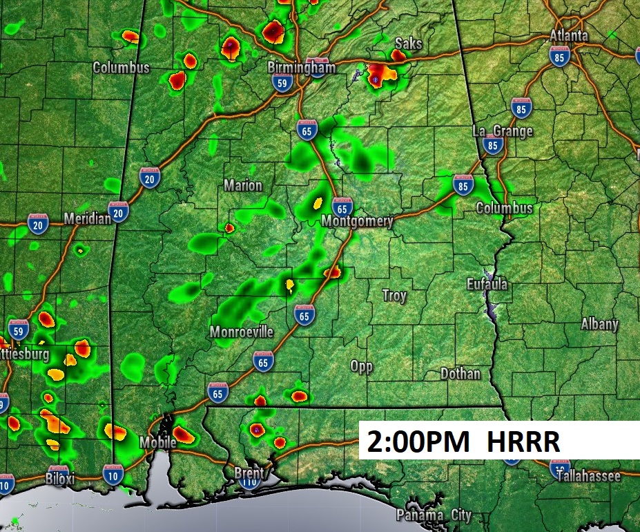 Good Morning! There were showers and a few thunderstorms on the radar again yesterday, but not many towns in our area got wet. A stalled front across the north Alabama is still in place today. The front will start to dissipate on Thursday. The risk of spotty showers and storms across the area for the next few days, through about Saturday. But, the best rain chances will continue across the northern counties today and tomorrow, and mostly prominent in the afternoon and evening hours. Not much rain is likely in central and south Alabama. Meanwhile, it continues quite warm with highs in the 80’s and lows in the 60’s. We’ll be closer to 90 Friday through Sunday. Here’s my brief video forecast discussion.