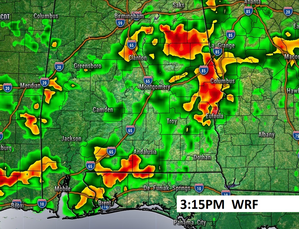 A couple of Future radar snapshots. The WRF Model looks a little wetter than the usually believable HRRR model.