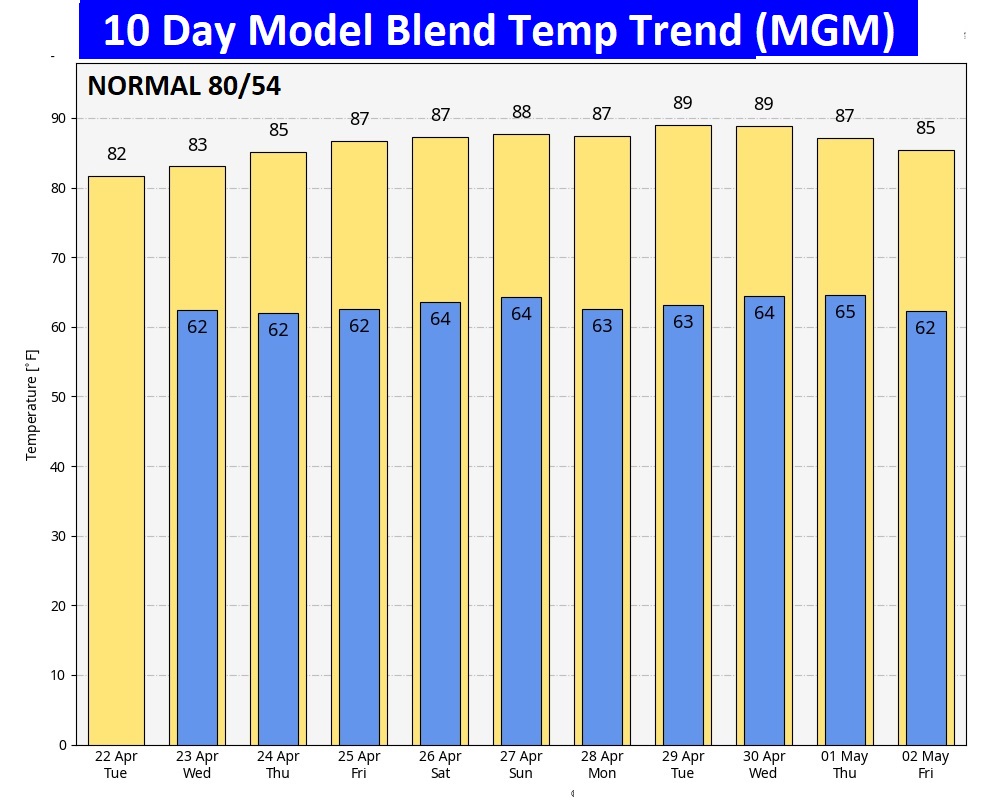 Here’s the 10 day model blend temperature trend. It continues to be a very warm pattern.