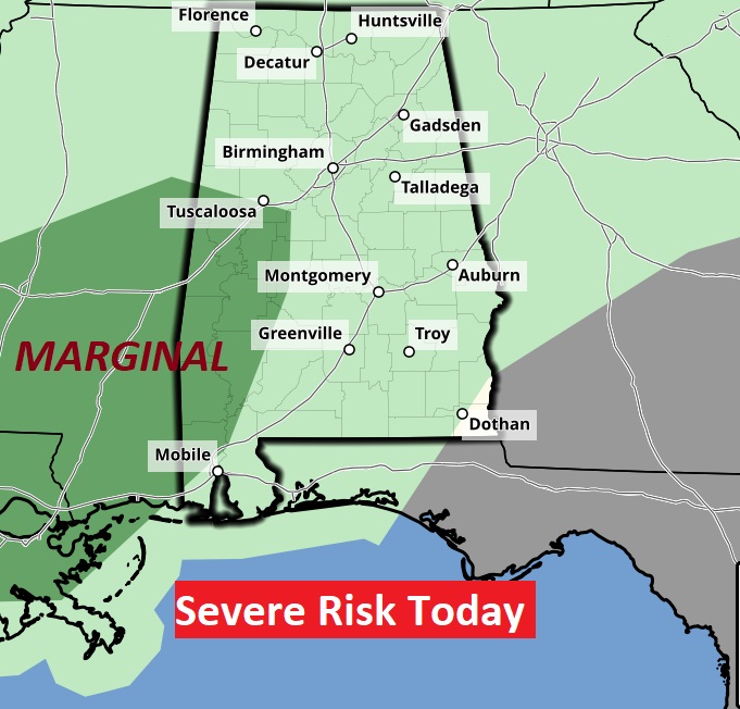 No significant Severe Weather Threat, but we note a Marginal Risk across parts of west Alabama.