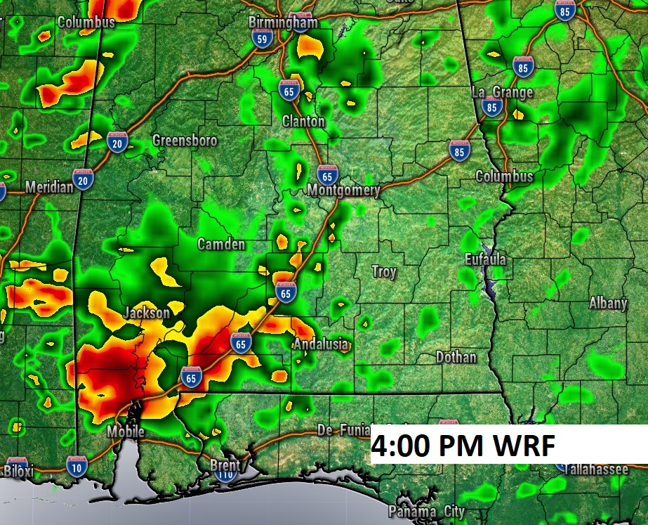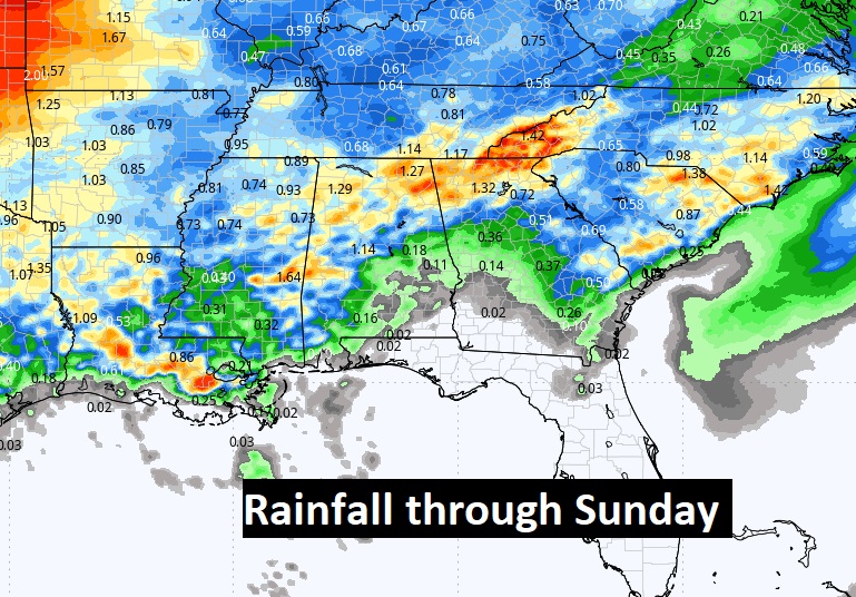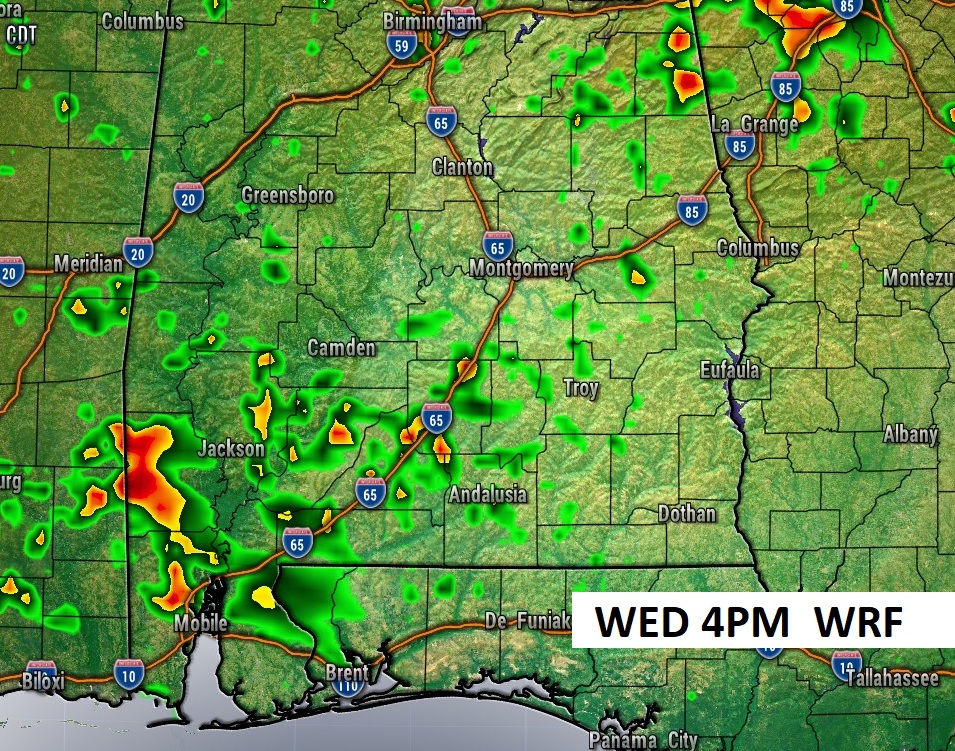 Here’s the expected rainfall this week. Not much for much of central and south Alabama. The better concentration will be in the northern counties, closer to the stalled front.