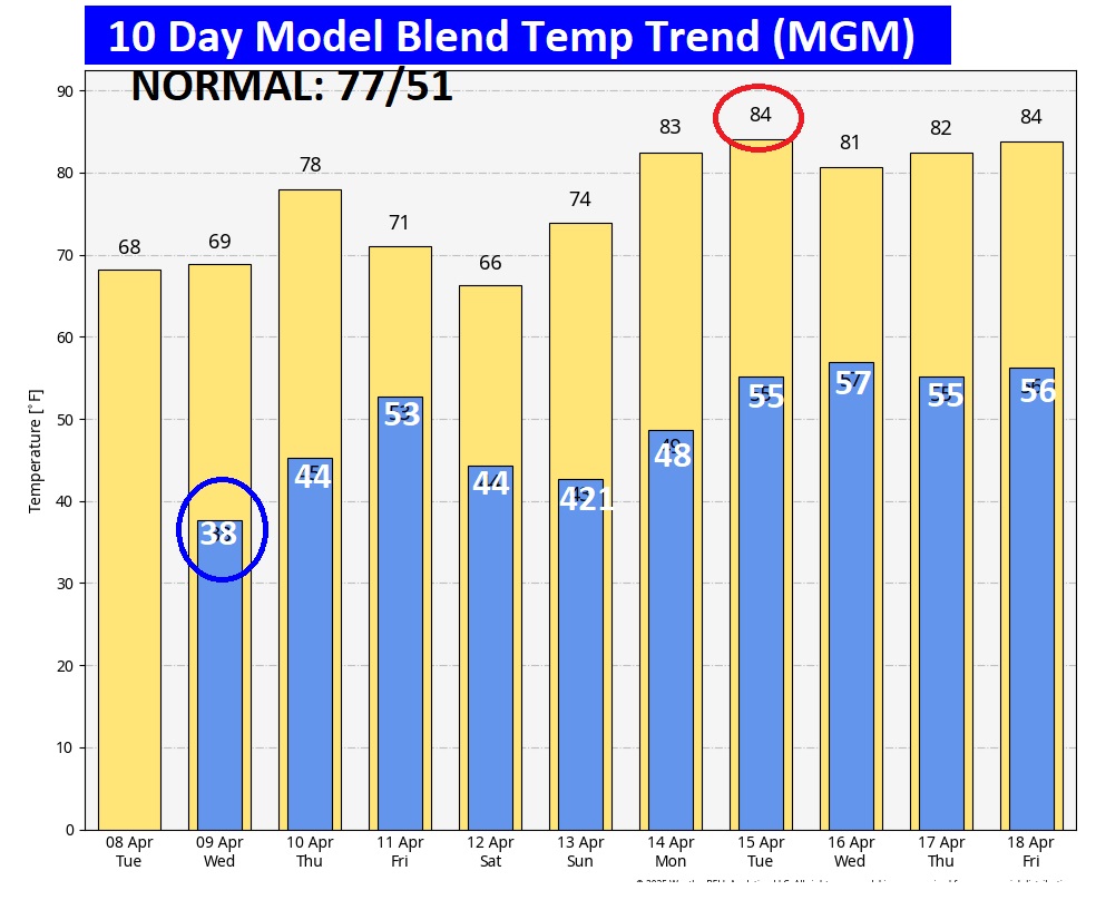 Late season chill.  Lows in the 30’s tonight.  Unusually cold for this late.  The northern counties will be near or below freezing in spots. Upper 30’s are likely in central Alabama.  Scattered frost is expected in central Alabama.