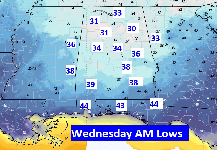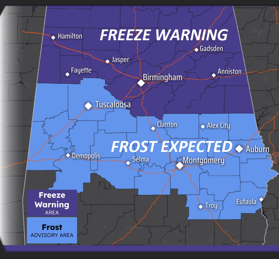 A Freeze Warning covers the northern third of the state.  Frost is expected by Wednesday morning deep into south central Alabama.