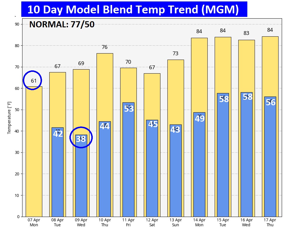 NEXT FEW DAYS: Much cooler days and cold nights. Tuesday’s high only mid 60’s. (Normal 77/50) The coldest will be Tuesday night. By dawn Wednesday, expect lows in the upper 30’s. Thursday will be the warmest day of the week. We’ll warm to the upper 70’s. It will turn cooler again Friday and Saturday. How would you like a Full Week with no severe weather? I have us storm-free all next week. There could be a few widely scattered showers Thursday night.