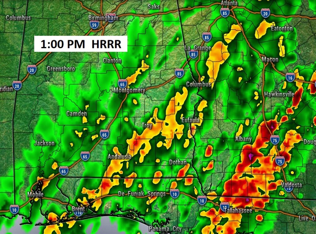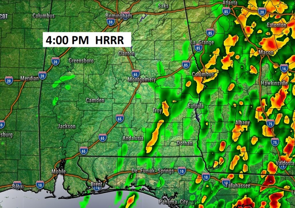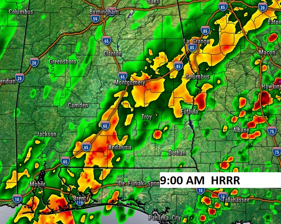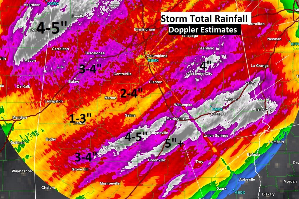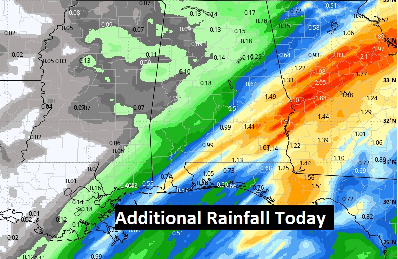 RAINFALL – PAST AND FUTURE: Daily rainfall records were set in many Alabama cities on Sunday. In Montgomery, total rain of 3.56” breaks the old daily record of 3.26″ in 1964. My rain gauge in East Montgomery had 4.85” Here’s Doppler radar estimates on Storm Total Rainfall so far. Some towns had more than 5”. This will give you an idea of what areas have had the most rain