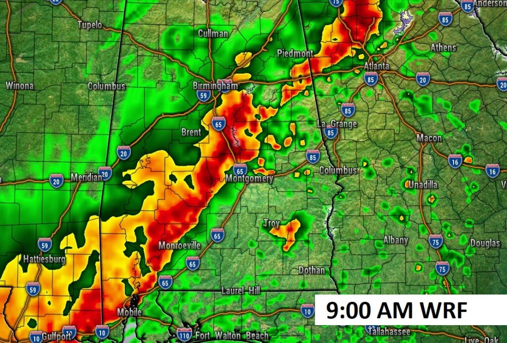 Future Radar shows the robust Squall Line (QLCS) sweeping through the area starting in the early hours of this day in through mid-day. Here are some hi-res model samples.  Some models are faster and some slower on the time line.  The WRF model appears fastest on the movement of the line. But, I have also included the FV3 and HRRR model samples