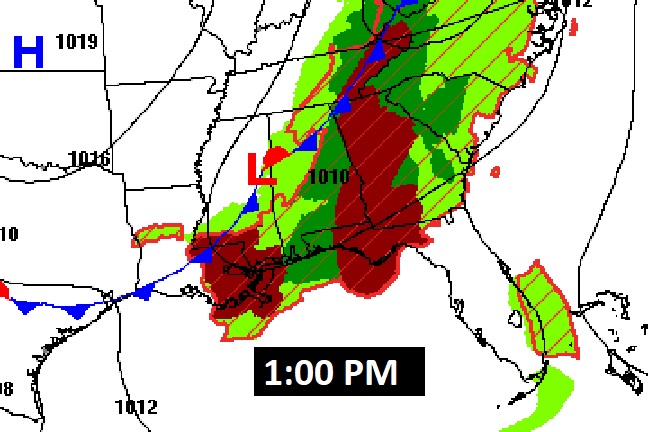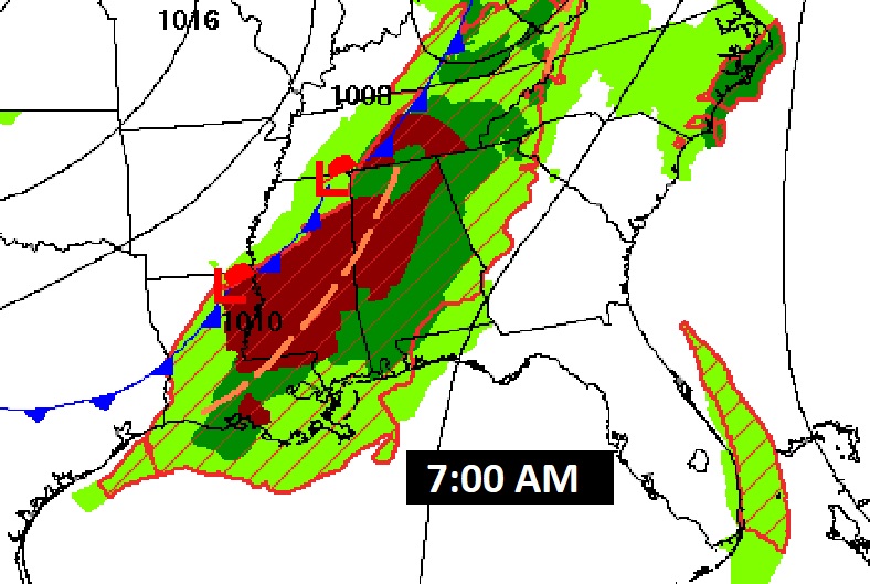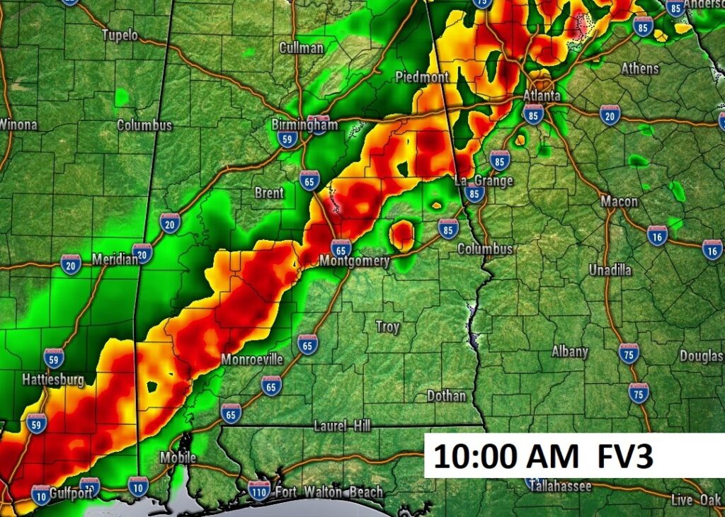The frontal system reaches extreme northwest Alabama this morning and progresses southeastward.