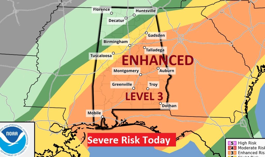 SPC is still highlighting a Level 3 out of 5 Severe Risk for much of the state.