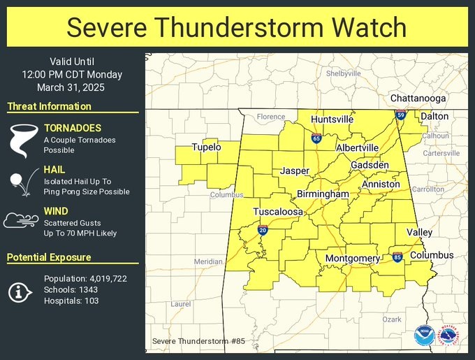 A severe Thunderstorm Watch covers much of north and central Alabama until Noon. Scattered wind gusts to 70 mph. A couple of tornadoes possible. Hail up to ping pong size. The watch extends as far south as Montgomery county. #alwx