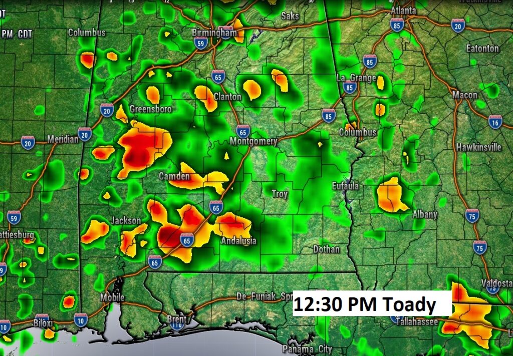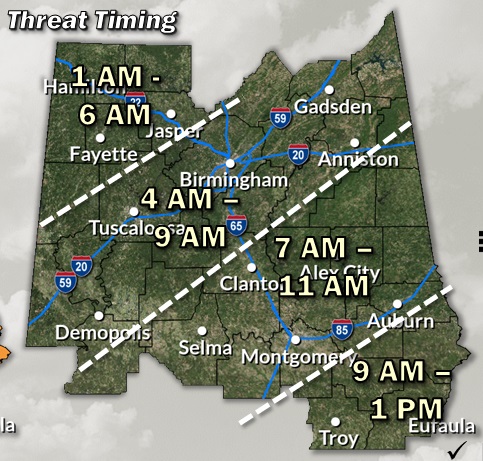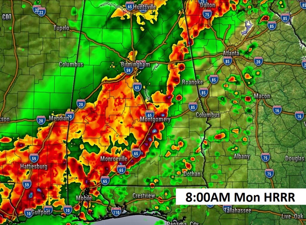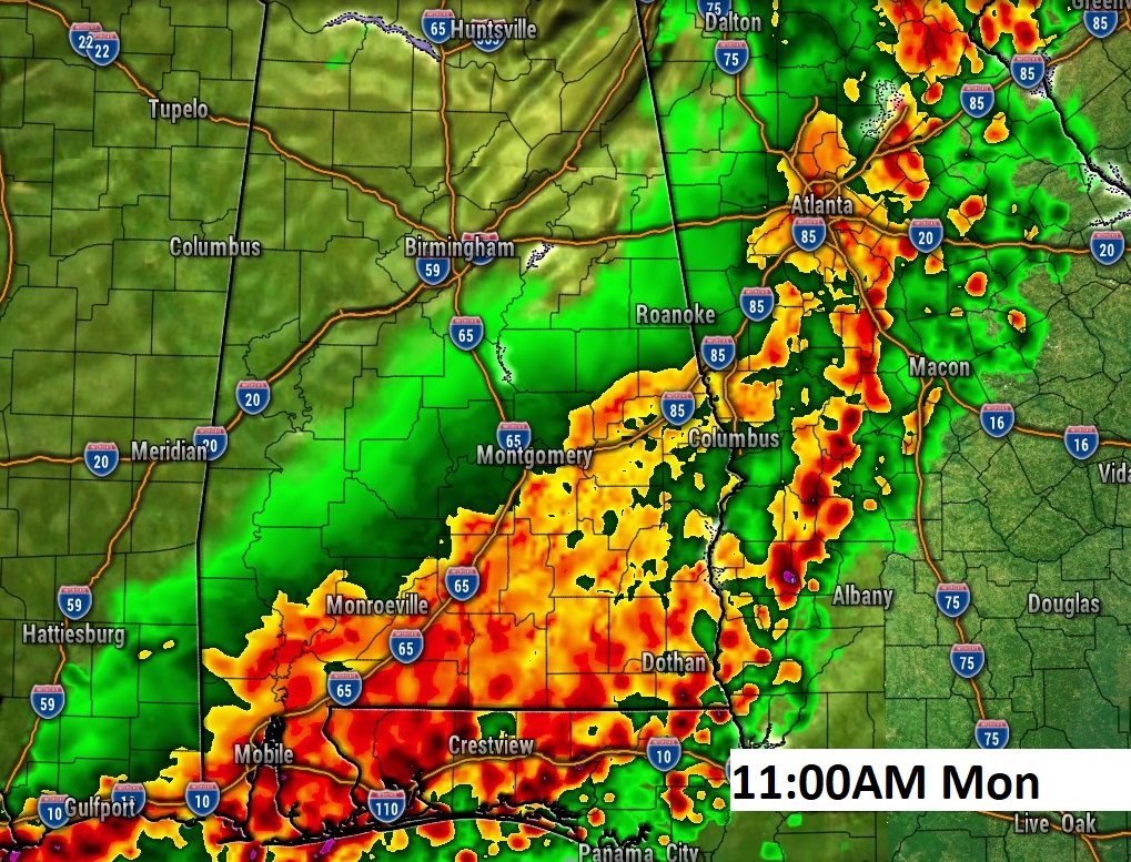 This map will help with your planning purposes for Monday. For many of us in the middle, 7AM to 11AM may indeed be the primetime hours, shifting into Southeast Alabama early in the afternoon.