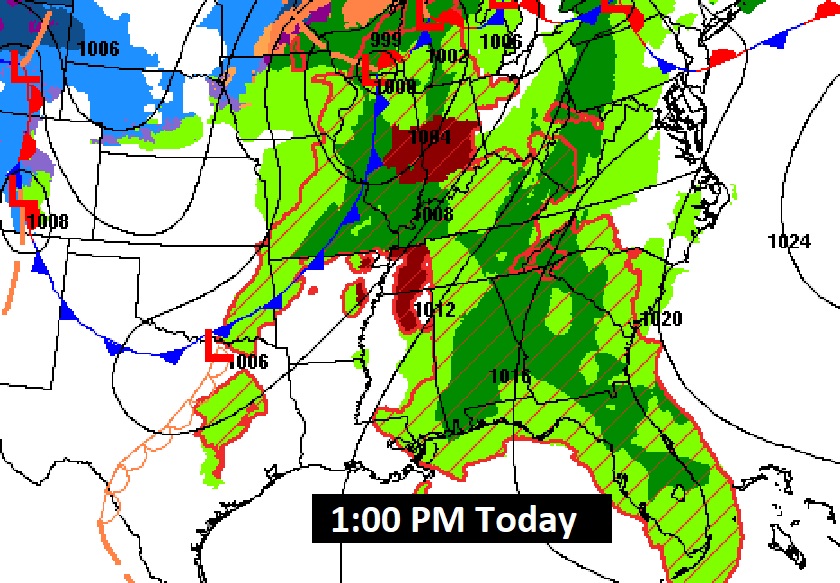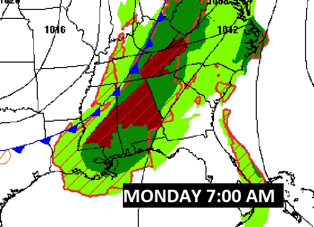 Here is the set-up Monday morning as the frontal system approaches. At 7AM, the frontal system will be in northwest Alabama.