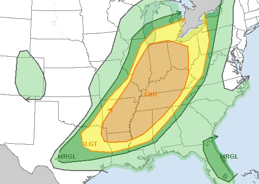 The main storm system is still well northwest of us today, battering the mid-section of the country with a sizeable severe risk from the Great Lakes to the ArkLaTex..