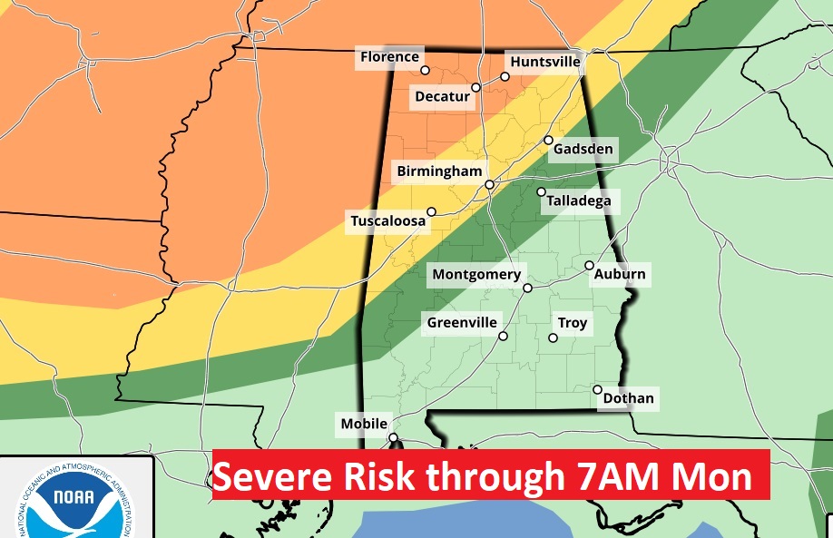 MONDAY SEVERE WEATHER THREAT:  First, here isthe Day 1 SPC outlook outlines a Level 1 through 3 risk across the NW half of Alabama through 7AM Monday.  Strong to Severe Storms could start affecting northwest Alabama after Midnight tonight.