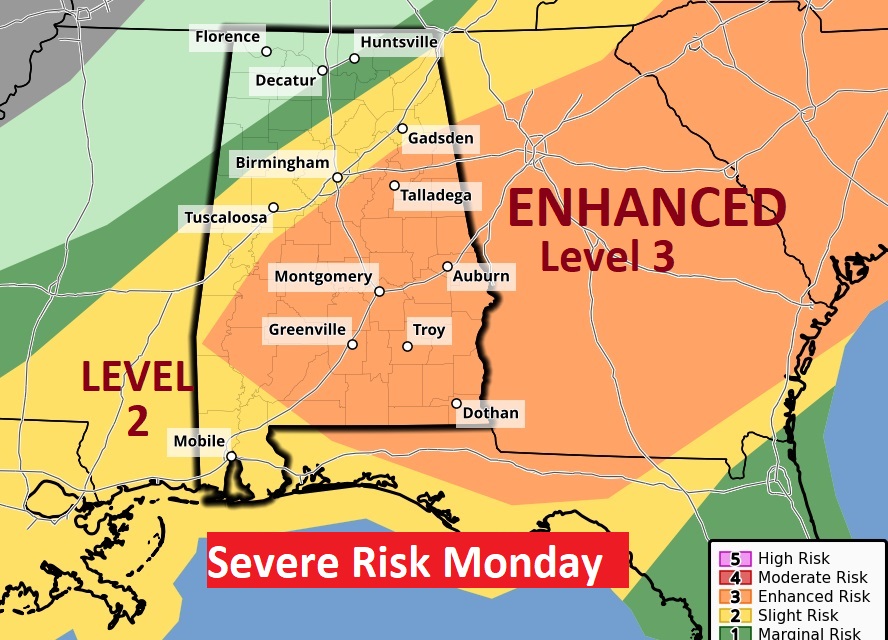 Good Morning!  Get ready for some very active weather.  Radar will be active at times today with showers and storms.  There could be even a few stronger storms. But, the main event is tomorrow, likely starting very early.  The greatest severe weather threat will be shifting into Southeast Alabama by mid-day Monday. The Storm Prediction Center has most of us a Level 3 out of 5 Enhanced Severe Risk. All modes of severe weather are on the table, including tornadoes, along a fast moving line of severe storms.  Damaging wind gusts are the main threat with embedded tornadoes. Hail is also possible.