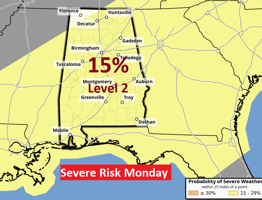 MONDAY SEVERE WEATHER EVENT: Still looks like the main event begins Monday morning into Monday afternoon. SPC is still highlighting a Level 2 (15%) Severe Risk on the Day 4 outlook through 7AM Monday, and the Day 5 Monday outlook. Expect all modes of severe weather including damaging winds, tornadoes and possible large hail.