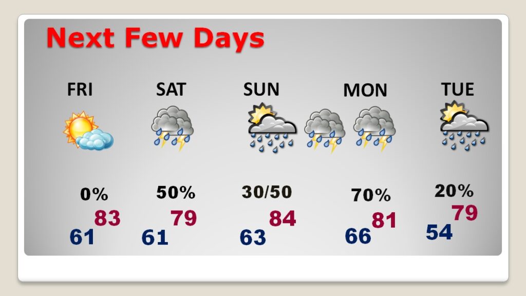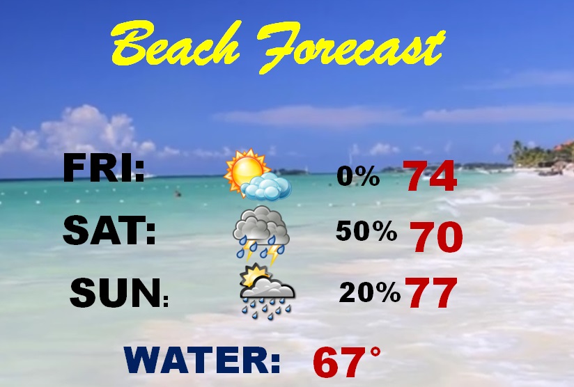 BEACH OUTLOOK: Dry Friday. Scattered showers and thunderstorms over the weekend. Spring-breakers: it will not be a washout. Strong storms arrive by Monday. Highs in the 70’s. Gulf water is 67.