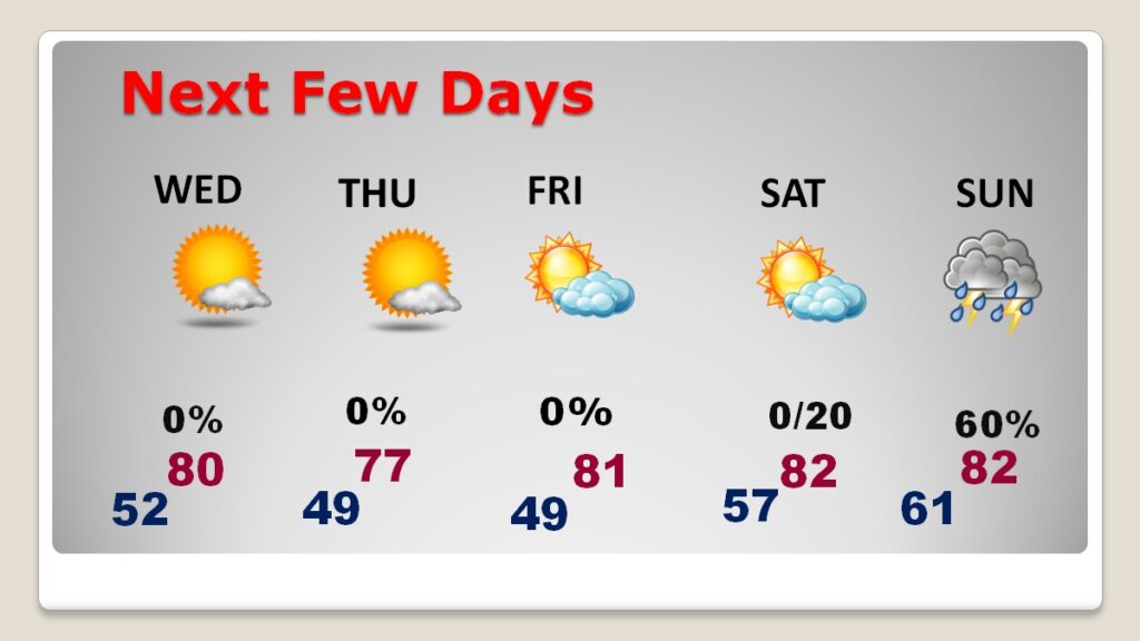 NEXT FEW DAYS: Just a beautiful work week of weather..Storm-free & dry. Abundant sunshine. Comfortably warm each day. Highs will be in the upper 70’s to lower 80’s each day through Saturday. Lows at night will range from the upper 40’s to the 50’s. (Normal 74/48). Looks like we’ll be dealing with another Severe Weather Threat this weekend, probably Sunday night into early Monday. The Storm Prediction Center already has at least a Level 2 risk, and we are several days out.