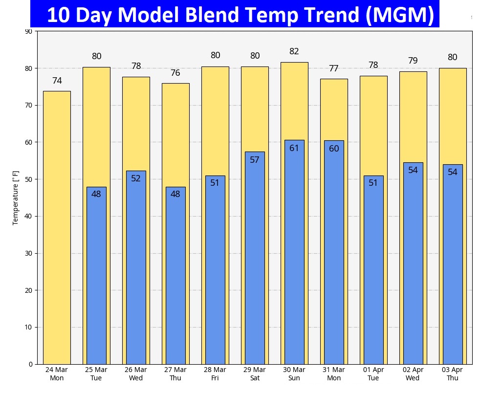 Here’s the 10 day model blend temperature trend. I do not see any signs of a late season cold snap in this forecast.