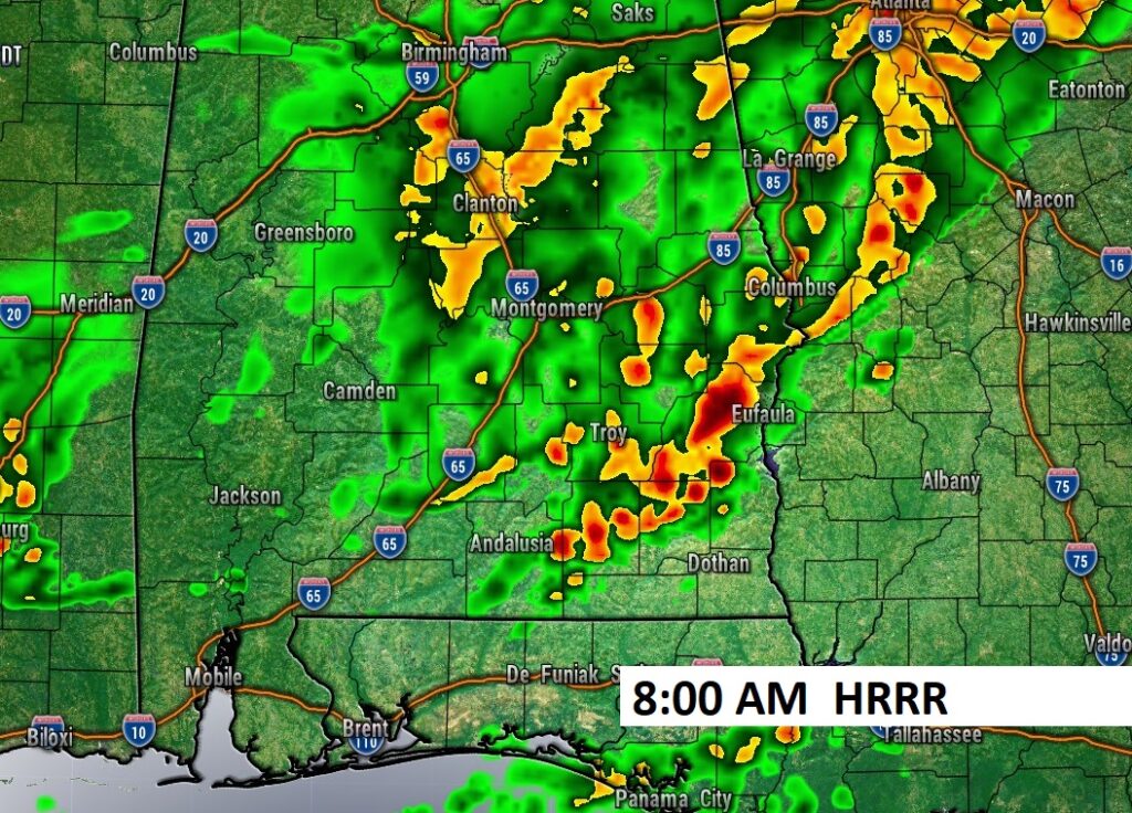 FUTURE RADAR: The most concentrated round of showers and storms will continue through this morning hours. But, there could be some leftover showers this afternoon especially in south Alabama.