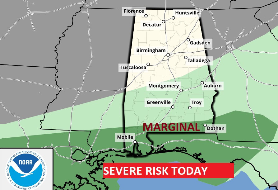 Marginal Severe risk today across the extreme southern counties.