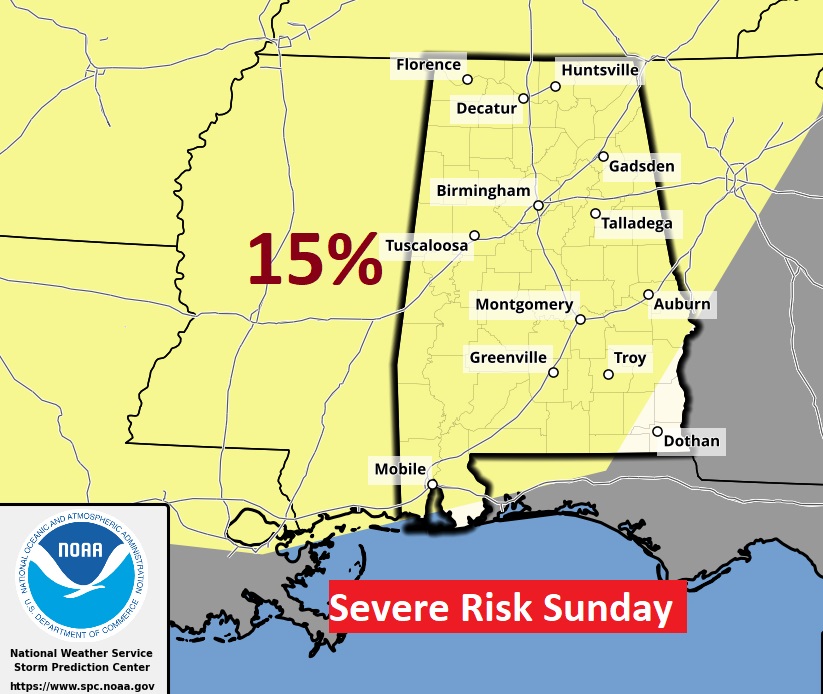 NEXT FEW DAYS: Expect a spectacular week of weather. March can be a very turbulent month. Not this week. Storm-free & dry. Abundant sunshine. Comfortably warm each day. Highs will be 80 or above each day through Saturday. Lows at night will range from the upper 40’s to the 50’s. (Normal 74/48) Right now, it looks like the next batch of showers and storms will arrive next weekend. Arriving probably Saturday night or Sunday. See below for the updated Sunday severe risk from SPC,