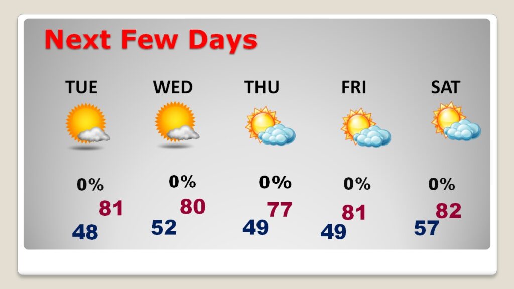CLIMATE: Yesterday’s High was 80, after a morning low of 43. (Normal 74/48)