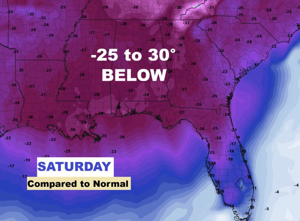 This map is a shocker.  -25 to 30 degrees below normal Saturday.   The GFS model.