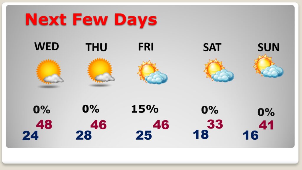 NEXT FEW DAYS:   Sunshine with upper 40’s Wednesday is a little better, but well below normal.  (Normal 61/37)