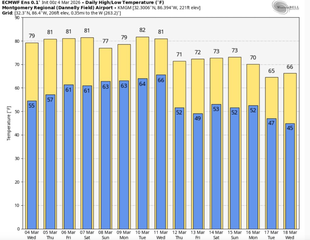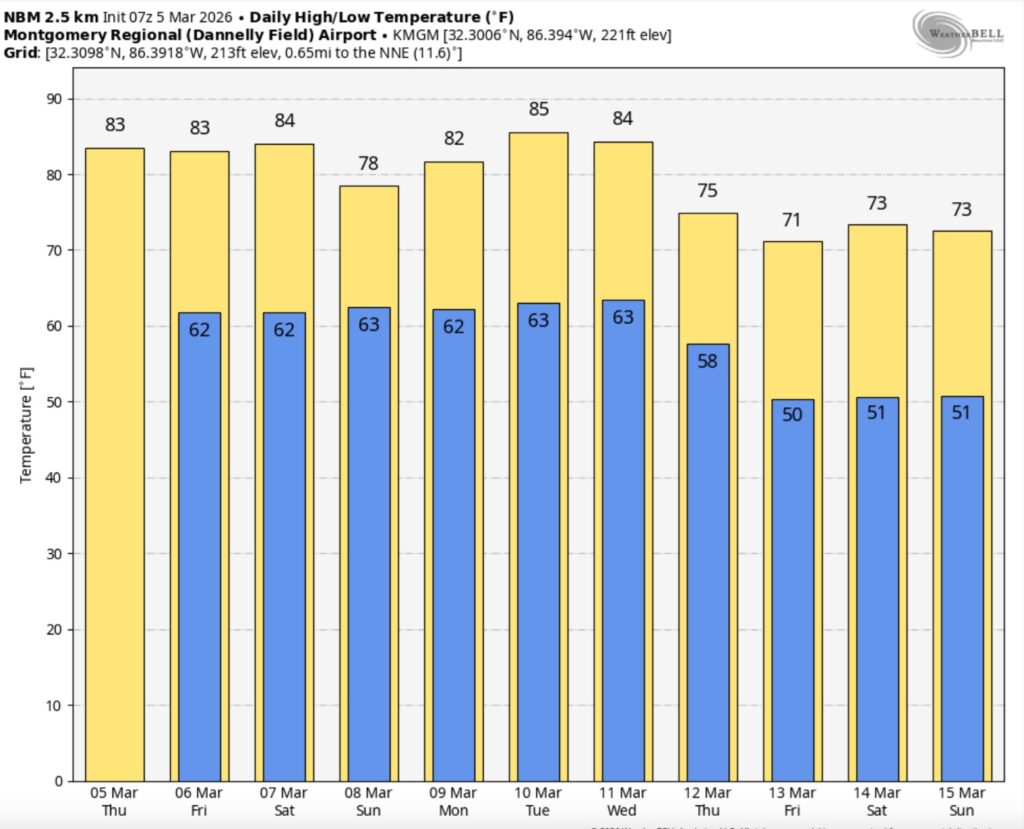 Good Morning! Our very warm pattern continues. Yesterday’s high was 82 in Montgomery. We will be in the low to mid 80’s today – and teasing records, were headed for the middle 80’s Friday and Saturday. Mild overnight lows in the low 60’s.