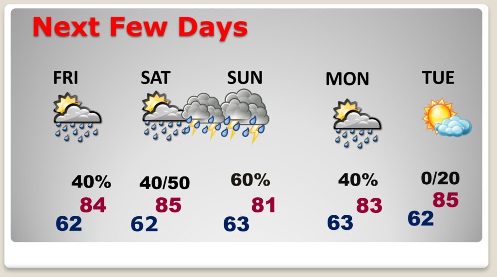 The risk of scattered showers and thunderstorms will be around each day Friday through at least Monday. Some strong/severe storms possible Saturday night & Sunday. Here’s my brief video forecast discussion.
