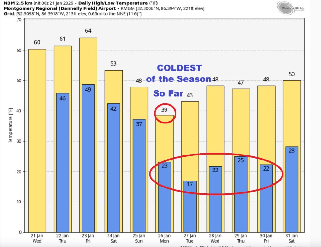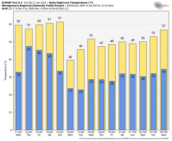 Good Morning! Today will be a little milder. High temperature near 60, making today the mildest day in quite a while. We should be near 60 again Thursday and Friday, before the bottom drops out this weekend. A risk of spotty showers begins overnight tonight and Thursday, with an increasing chance Friday. Rain is likely Saturday and Saturday night. There is growing concern that a significant winter storm will affect Alabama and much of the south this weekend, involving multiple severe impacts. Worst of which would be a major ice storm across the northern half of our state, and through much of the Southern US. There are still many questions on how this might unfold and how severe the impacts will be. How far south would the Winter Weather impacts extend? It’s not out of the question that some of us will deal with a Freezing rain situation at some point over the weekend. There will be plenty of bitterly cold Arctic air available. Meanwhile, and ample supply of moist Gulf moisture will override the shallow cold air, creating a dangerous scenario for what could be a crippling ice storm for parts of our state, especially from I-20 northward. Stay tuned, as we continue to dissect the future details of this potential Southern Winter Storm. We’ll know much more each day. In today’s Blog update we’ll dive into much deeper detail. Here’s my video forecast discussion.