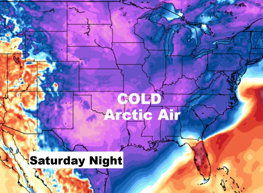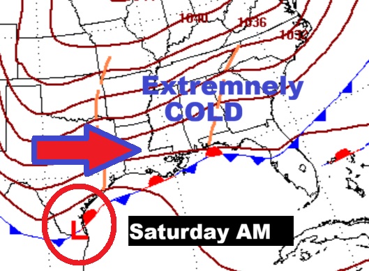 Here’s the Saturday set-up. Low pressure will develop along the Texas Gulf coast and slide eastward across a Gulf coast frontal system. Meanwhile, plenty of Bitter Cold Arctic air will be in place.