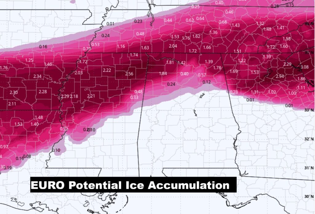 As you look at these potential Ice Accumulation numbers from some of the models – consider this. .10” of ice Accumulation causes major travel issues and spotty power outages. .25”+ is a major ice storm with widespread power failures. In this case, some models are suggesting .75” or greater in parts of NW Alabama and neighboring states. This would qualify as a CRIPPLING, catastrophic Ice Storm, with severe impacts for several days. Unthinkable. NOTICE: Interesting that the EURO has shifted northward on the latest run. Could this be a trend?