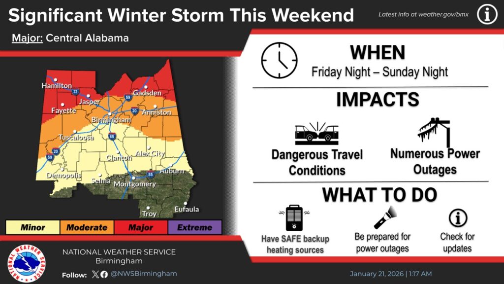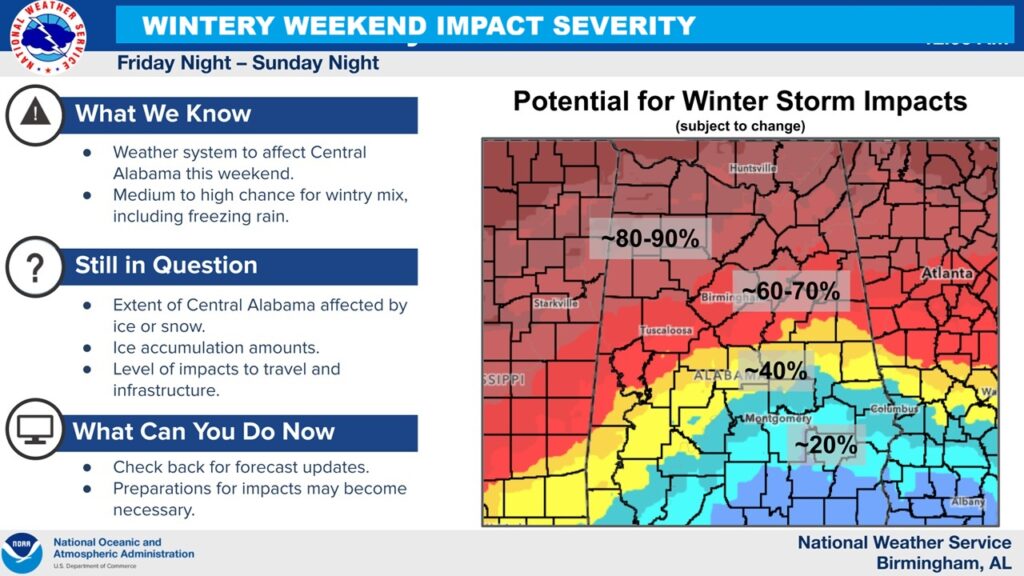 WEEKEND WINTER STORMS THREAT?: There is growing concern over a multi-state weekend winter storm, with potential multiple high impacts. It’s a very complicated. There are still many questions on how it will unfold. How far south would the Winter Weather impacts extend? There will be plenty of cold air available, overriding an ample supply of Gulf moisture. This graphic below from National Weather Service and it will continue to be refined and updated all week. It shows the probability of Winter impacts –ranging from as low as 20% in the US 80/I-85 corridor to 90% in Northwest Alabama, where extensive power outage are possible due to freezing rain – ice accumulation.