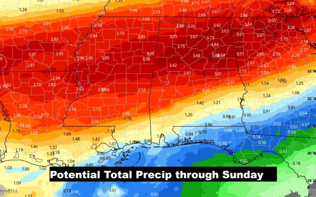 A wide area of South Alabama may not have any impacts at all. It will probably be all liquid for a lot of folks across the southern half of our state. Here’s the projected liquid precipitation forecast through Sunday.