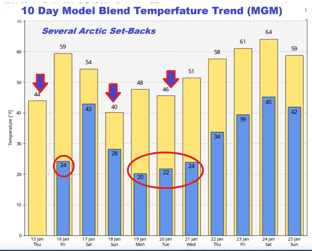 Here’s the model blend 10 day temperature trend. There will multiple Arctic Temperature set-backs.