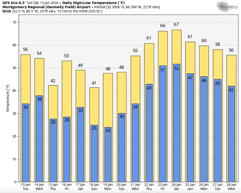Good Morning! It’s a very cold forecast starting with some brutal uncomfortable morning wind chill with low teens in many spots. Today will be a raw winter’s day. Wind chill will be a big factor. A few showers could pop up late Friday night ahead of another cold front. Widely scattered showers possible. Then, yet another front and potential low pressure development in the Gulf could cause some interesting possibilities pre-dawn Sunday. Could rain mix with some snowflakes over the SE third of the state? Maybe. Probably not. The main point is there would be NO ACCUMULATIONS. The main story over the next several days will be repeated Arctic Incursions with Cold days and Brutally Cold nights. As you’ll see on the 16 day EURO trend, more reasonable temperatures will return by late month. Hang on. Here’s my brief video forecast discussion.