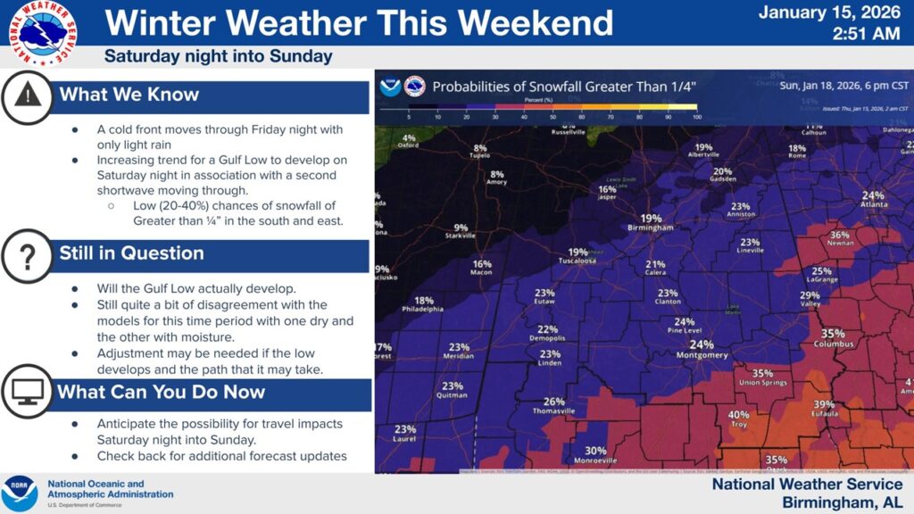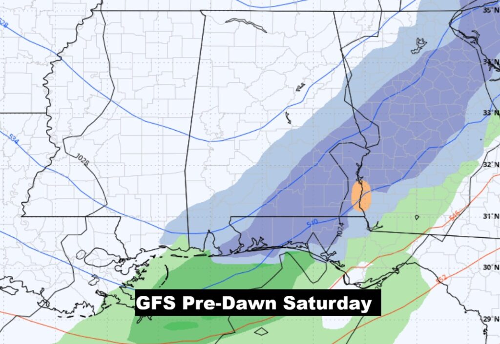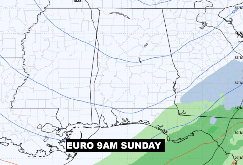 WINTER WEATHER ISSUES PRE-DAWN SUNDAY?: Lots of folks will go crazy speculating on the possibility of of a few raindrops mixing with snowflakes pre-dawn Sunday morning. It all depends on potential low pressure developing in the Gulf. Will it Happen? What about timing? Chances are very tiny. Obviously, there would be no accumulation. Is this a big deal? Absolutely not. Here’s a couple of snapshots of the GFS and EURO models. The GFS is more bullish on the chance of ANY snowflakes.