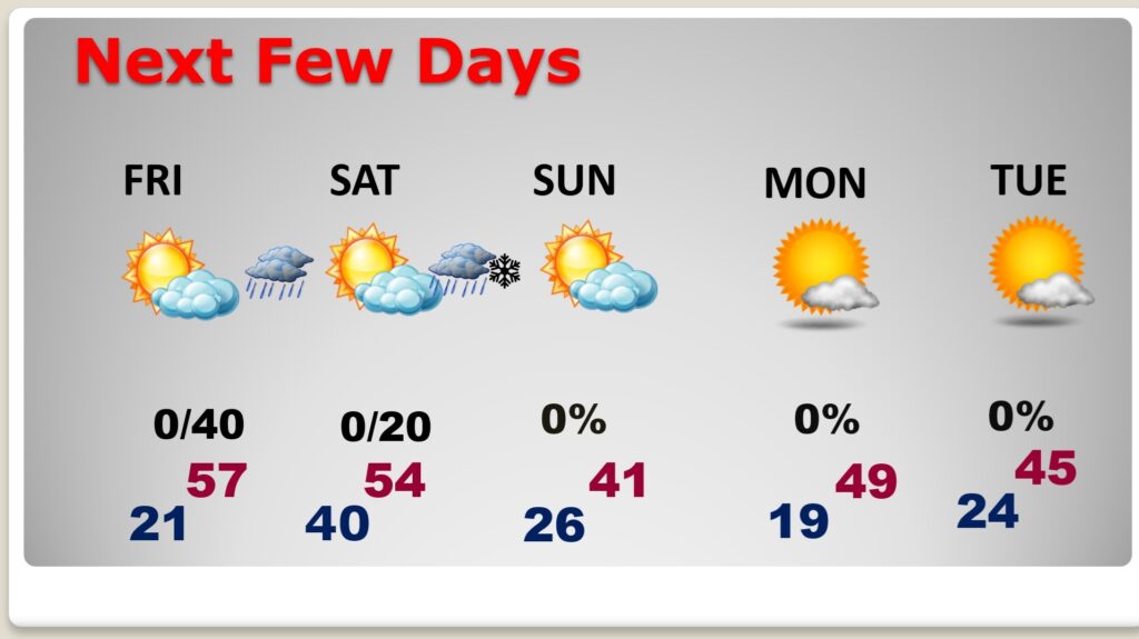 TODAY: Suny, breezy and quite cold. High in the lower 40’s. NW wind gusting as high as 20/25 mph. Wind chill during the day in the 20s/30s. TONIGHT: Clear and very cold. Low 20-22.