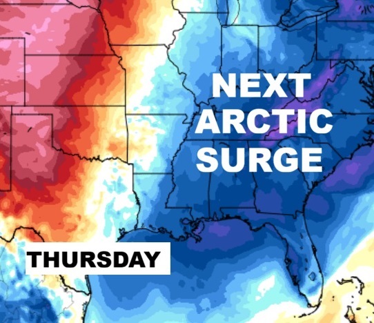Here’s the model blend 10 day temperature trend. There will multiple Arctic Temperature set-backs. Coldest air of the season so far with the next cold front arrives late Wednesday night. And, yet another “cold shot” over the weekend, by Saturday night & Sunday.