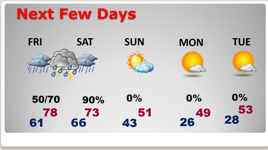 A nice warming trend is underway with highs in the 70’s Our next weather maker will bring rain and thunderstorms by Friday and Friday night into Saturday. Some storms could be severe. Marginal Severe Risk. Sharply Colder Arctic Air follows starting Sunday. We’ll be in the 20’s Sunday night.