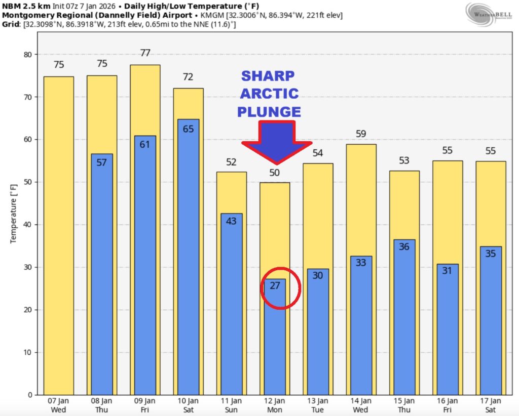 Here’s the model blend 10 day expected rainfall outlook. Warm through Friday with highs in the 70’s. Sharply Colder Arctic Air follows starting Sunday.