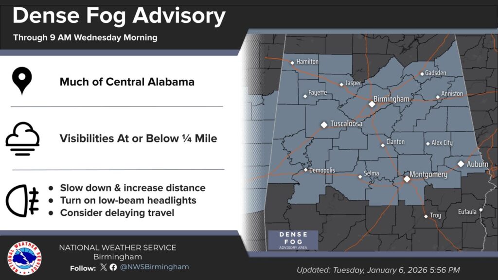 TODAY: DENSE FOG ADVISORY. Areas of dense fog before 9am. Otherwise, partly sunny, with a high near 75. West wind around 5-10 mph. TONIGHT: Mostly cloudy, with a low around 55.