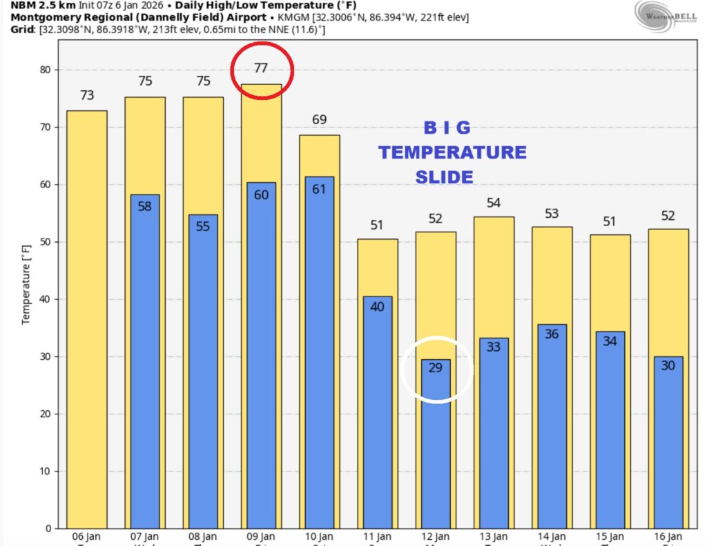 Here’s the model blend 10 day expected rainfall outlook. Warm through Saturday with highs in the 70’s.   Then, a big drop. An extended period of much cooler air will follow.