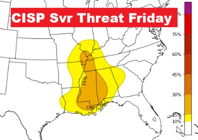 Here’s one of the Severe Weather Experimental models showing the Severe Risk starting Friday night.