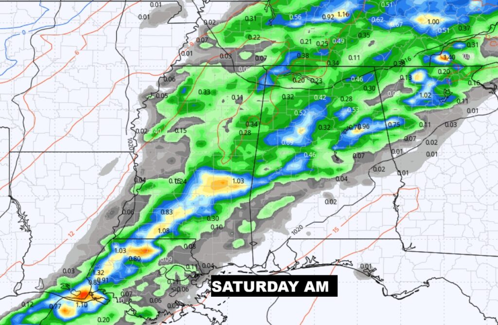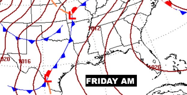 Next big weather maker.   Greatest risk of showers and storms Friday night through mid-day Saturday. Some storms strong possibly severe.
