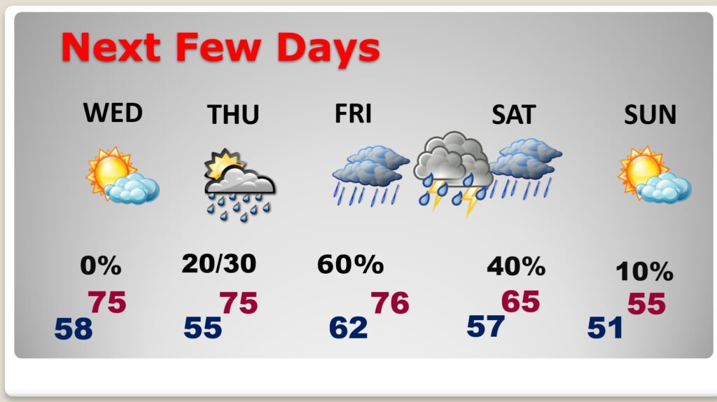 Good Morning!   After some morning patchy dense fog this morning, we have a nice day ahead. Today’s high should reach the low to mid 70’s.  (Normal 59/37)   We’ll be in the 70’s today through Friday.  Our next weather maker will bring rain and thunderstorms by Friday and Friday night into Saturday.  Some storms could be strong, possibly severe.  Much cooler air will follow.  Here’s my brief video forecast discussion.